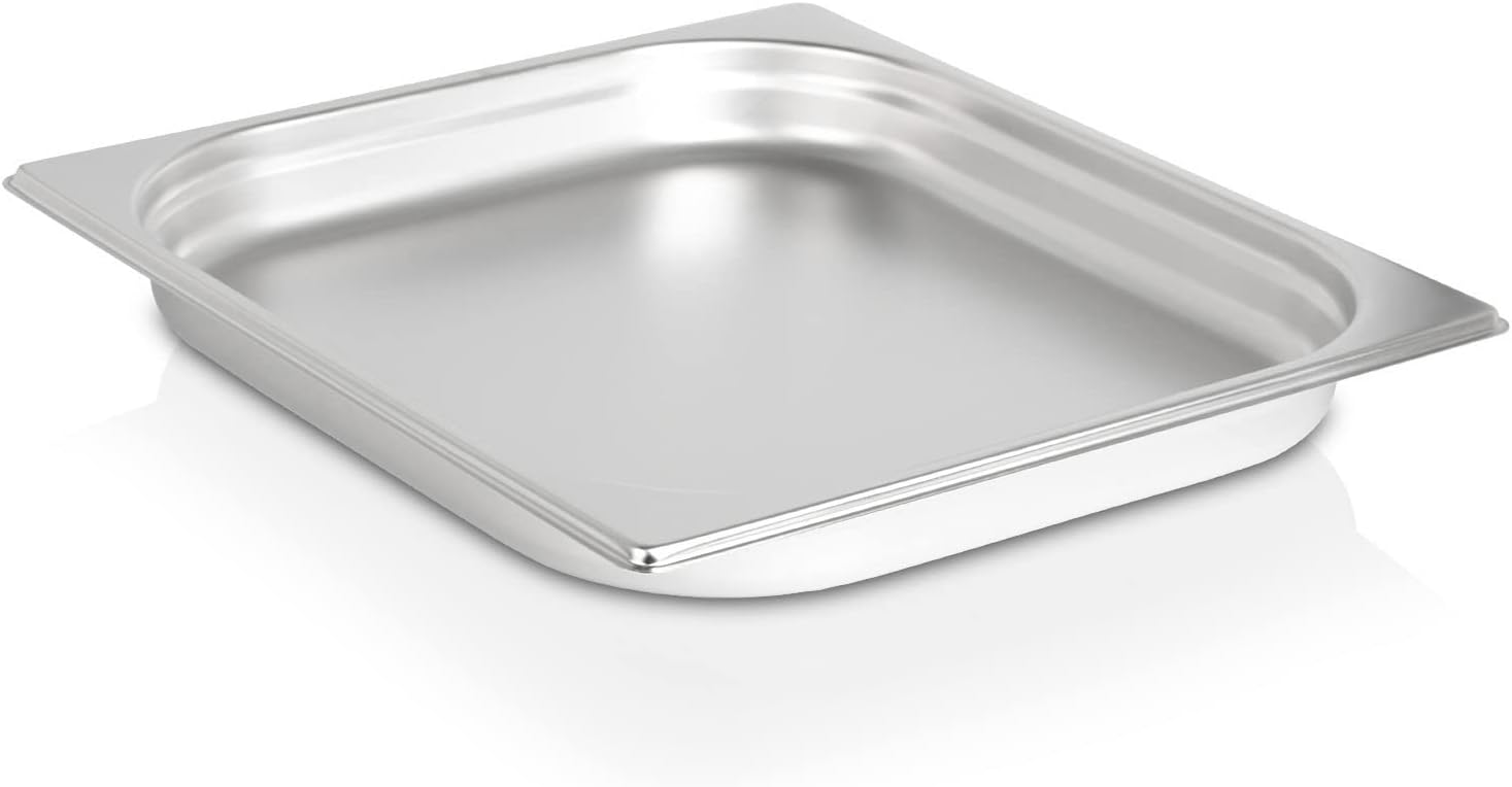 I contenitori Gastronorm GN 2/3 h 40 mm che offrono un ampio intervallo di resistenza termica (da -40 °C a 300 °C e oltre) sono realizzati quasi esclusivamente in acciaio inossidabile di alta qualità, solitamente AISI 304. L’acciaio inox è l’unico materiale comunemente utilizzato per i contenitori Gastronorm che soddisfa l’intero intervallo di temperatura specificato, rendendolo adatto sia per il congelamento che per la cottura in forni a convezione, l’uso in bagnomaria e chafing dishes. Forma: Rettangolare, con angoli arrotondati per facilitare la pulizia e l’impilamento. Bordo: Presentano un bordo sporgente e piatto su tutti i lati, che ne consente il posizionamento standardizzato su carrelli, supporti, bagnomaria e all’interno di forni o frigoriferi. Materiale (Acciaio Inox): Hanno una finitura metallica lucida o satinata, sono opachi e riflettenti. Sono spesso sottili ma robusti.