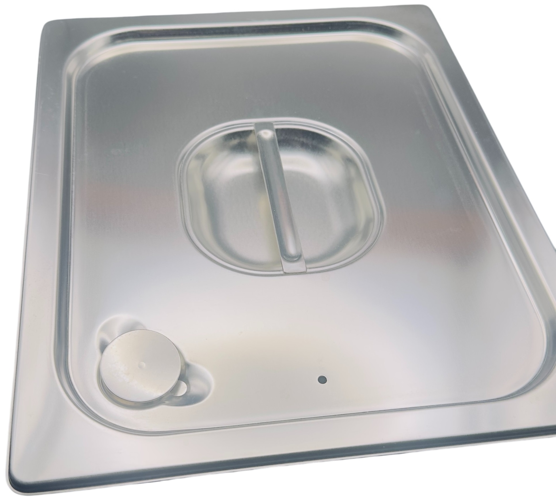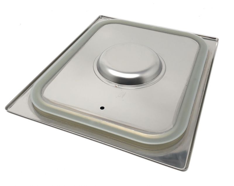 Coperchio Gastronorm 1/2 interamente in acciaio Inox AISI 304. Con guarnizione a tenuta. dim 325×265 mm. Guarnizione al silicone per uso alimentare. Completo di foro di compensazione. Made in Italy
