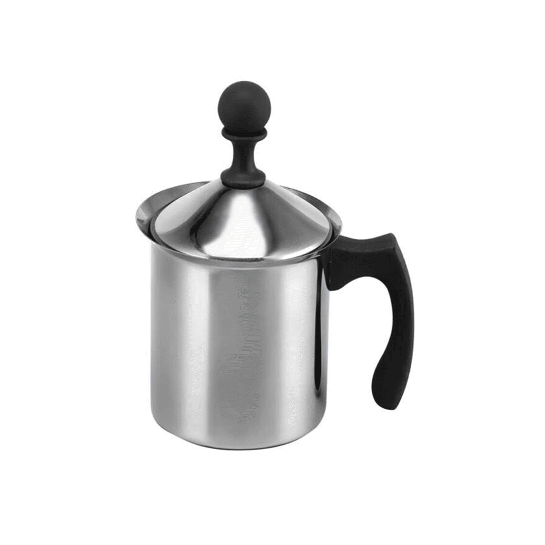 Cappuccinatore da 40 cl in acciaio inox con rete interna, ideale per montare latte e preparare cappuccini, schiume e bevande calde. Il manico in nylon garantisce una presa sicura e comoda, mentre la struttura resistente assicura durata e facilità di pulizia. Perfetto per uso domestico e professionale.