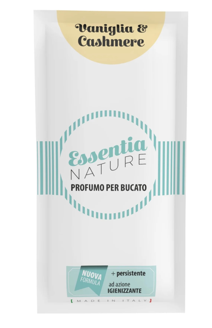 Essenze Profumate per il Bucato: solo i migliori estratti di olii essenziali naturali, privi di sostanze tossiche o cancerogene, per regalarti profumazioni uniche e sorprendenti su ogni tipo di tessuto. Dermatologicamente Testate: Le formulazioni ESSENTIA sono dermatologicamente testate per pelli sensibili (PATCH TEST pelli sensibili) presso laboratori indipendenti che hanno condotto i test su volontari tutti con pelle sensibile. Il test è stato applicato su 140 volontari con pelle sensibile, di età compresa tra i 18 e i 70 anni. Sia di sesso maschile che femminile. Con uso continuativo per 4 settimane consecutive più volte alla settimana. 100% avevano pelle sensibile ed il prodotto Profumatore per Bucato ESSENTIA è stato classificato con una ottima accettabilità cutanea quindi può vantare il claim “TESTATO SOTTO CONTROLLO DERMATOLOGICO” Profumazione Duratura: la Microincapsulazione permette di mantenere vivo il profumo a lungo nel tempo l’intensità del profumo aumenta con lo sfregamento dei tessuti. Azione Igienizzante: Speciale Formula con Sali Quaternari, che rendono più sicura l’igiene dei tuoi capi per tutta la famiglia Packaging Green: il Flacone è prodotto con Materiali di Origine Vegetale (canna da zucchero) ed è sigillato con un elegante Tappo in Alluminio Riciclabile ed a tenuta garantita Made in Italy: prodotto formulato e realizzato in Italia, sottoposto a scrupolosi Controlli di Qualità e sono certificato presso l’Istituto Superiore di Sanità La Fragranza Vaniglia & Cashmere Sensuale ed inconfondibile, leggera e piacevole, impreziosita dal pregiato legno asiatico di cashmere per una fragranza dolce, delicata e dalle note Gourmand. Dal naturale splendore di un giardino in fiore si diffonde un aroma paradisiaco. Vaniglia è una fragranza calda ed avvolgente, che trasmette quiete e relax, grazie anche all’aggiunta di dolci sentori di caramello. NOTE DI TESTA: Ambra – Anice – Mughetto – Gardenia NOTE DI CUORE: Fior di Vaniglia – Caramello – Muschio NOTE DI FONDO: Eliotropio – Fava Tonka – Sandalo Modalità di Utilizzo IN LAVATRICE: versare 10/20 ml di prodotto nella vaschetta della lavatrice dedicata all’ultimo risciacquo, a seconda dell’intensità del profumo che si vuole ottenere. Si consigliano 15-20ml di prodotto ogni 5-7 kg di bucato. IN ASCIUGATRICE: versare qualche goccia su un fazzoletto o un pezzo di tessuto e posizionarlo all’interno dell’asciugatrice. A MANO: aggiungere 10/20 ml di prodotto ogni 5 litri d’acqua nell’ultimo risciacquo utilizzando guanti protettivi. Prodotto concentrato. Agitare prima dell’uso.