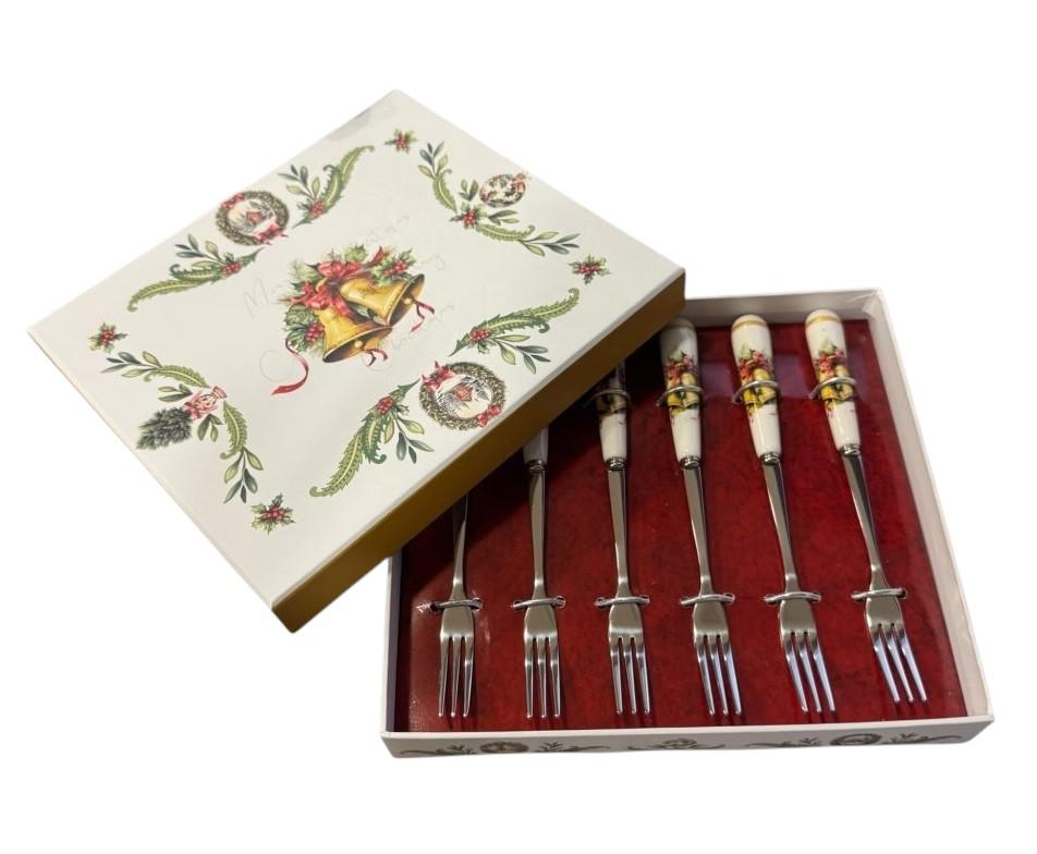 Fade Bells, set 6 forchettine natalizie La scatola che lo racchiude è decorata con un design ispirato al Natale, per un tocco di allegria in tavola. Realizzata in materiali di alta qualità, sarà un’elegante aggiunta alla tua collezione di stoviglie. mis. cm 19 x 17 x 3