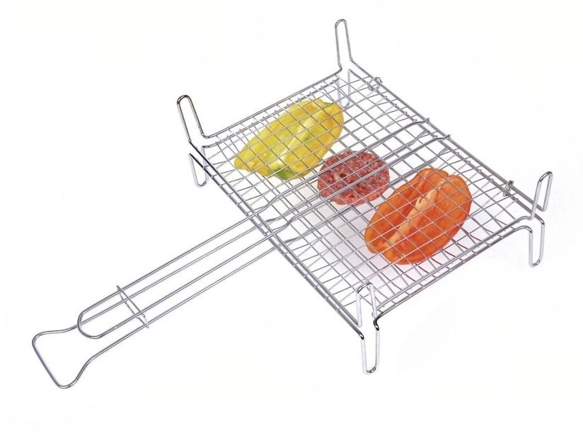 griglia per BBQ con manico e piedi in ferro cromato In filo di ferro cromato Cromatura TRIMAC III (processo sicuro e tutela dell’ambiente) Il prodotto rispetta la normativa Europea a tutela del consumatore come da direttiva: 76/769 CEE e aggiornata dalla 2002/61/CEE e 94/27/CEE