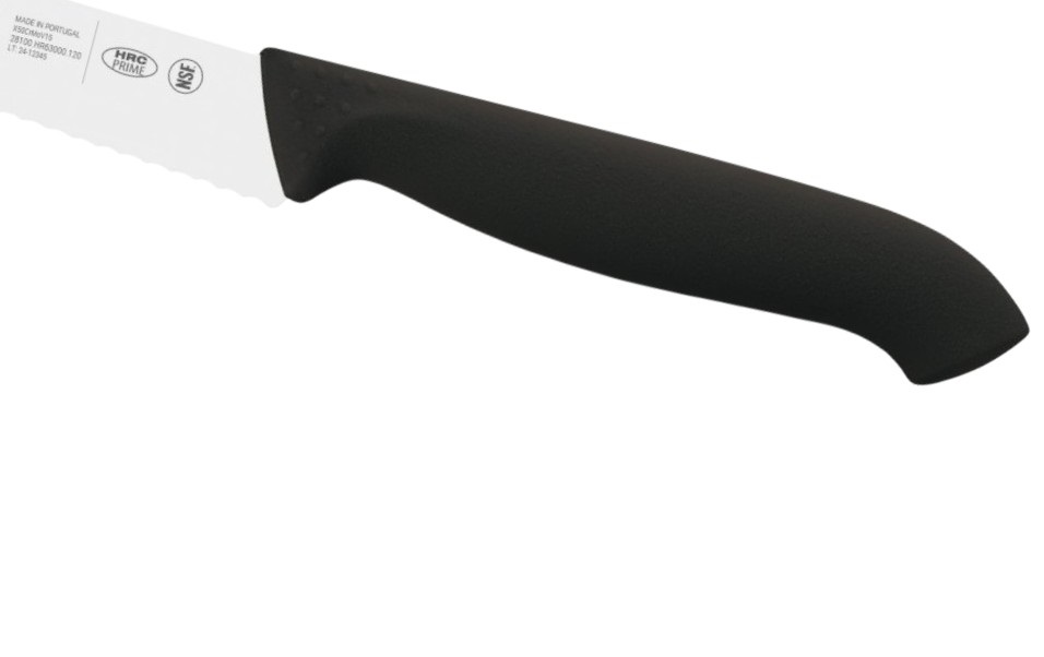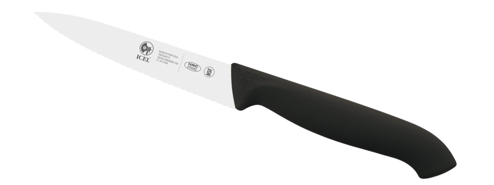 Coltello con lama appuntita e seghettata, ideale per tagliare e decorare frutta e verdura. La lama seghettata consente di tagliare la buccia dura dei pomodori senza schiacciarli, garantendo un taglio netto. Lama in acciaio inossidabile di alta qualità, al cromo-molibdeno-vanadio (X50CrMoV15), con codolo a metà codolo che penetra nell’impugnatura per circa metà. Temprata per raggiungere una durezza di 57 ± 2 HRC. Affilata a mano da esperti per ottenere un angolo di affilatura perfetto e garantire una potenza di taglio duratura. Il manico è stampato a iniezione in Proflex, un materiale duro e resistente, in grado di resistere ai danni derivanti dall’uso quotidiano. L’assenza di fessure in cui possano accumularsi residui di cibo garantisce sicurezza e una pulizia facile ed efficace. Garanzia illimitata contro qualsiasi difetto di fabbricazione o di materiale Prodotto in Portogallo Horeca Prime – Una linea di coltelli pensata per soddisfare le esigenze del settore professionale. Il manico presenta un design ergonomico, che ne aumenta il comfort durante l’utilizzo. La sua texture offre una presa migliore, anche con le mani bagnate, garantendo maggiore sicurezza ai professionisti. Grazie alla sua semplicità e leggerezza, la linea si distingue per essere facile da affilare, lavare e maneggiare