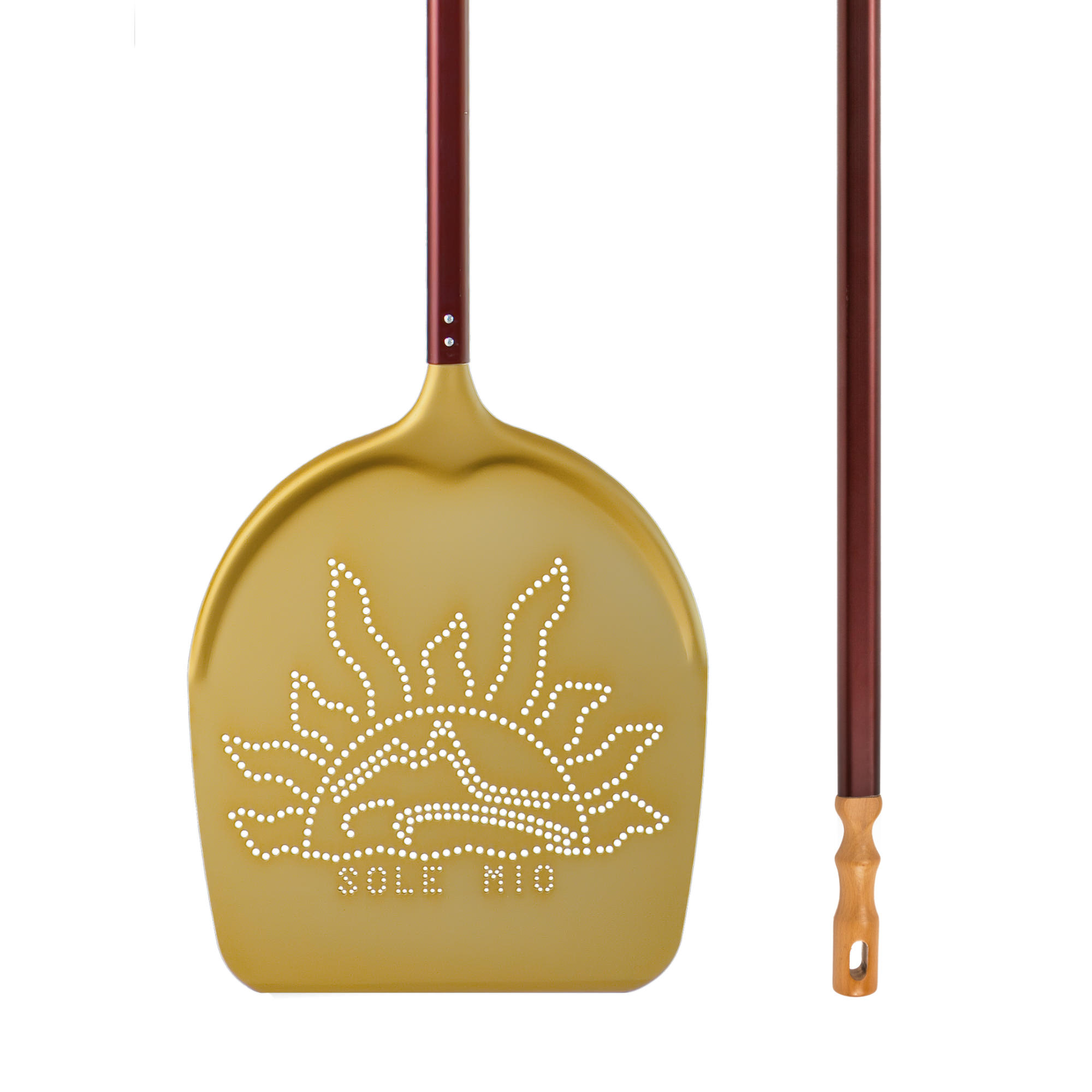 La pala Sole Mio è una pala professionale forata top di gamma, ideale per i pizzaioli professionisti che cercano un prodotto di alta qualità e durevole per infornare le loro pizze.