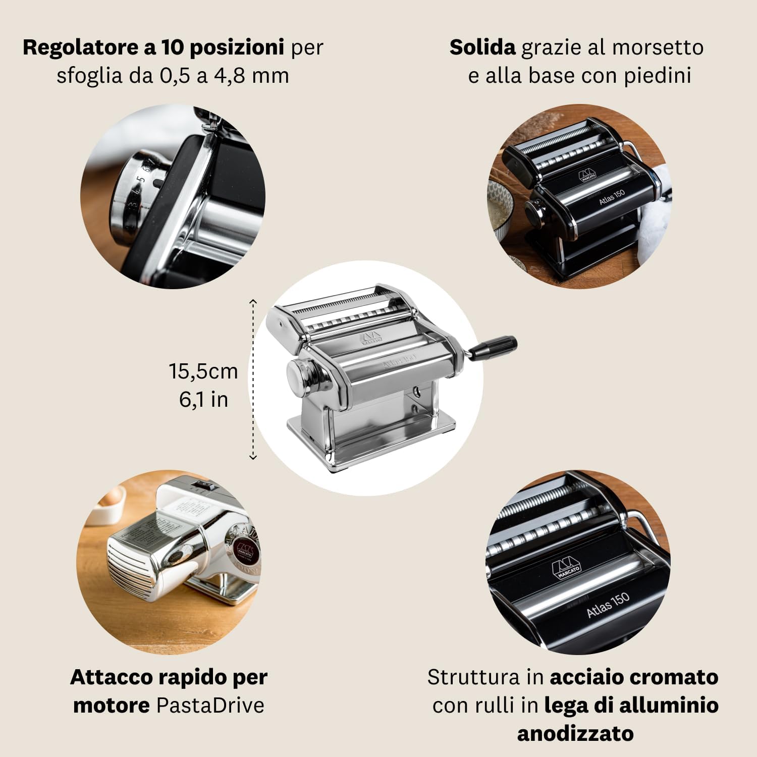 La macchina per la pasta più popolare in casa. Icona del Design Made in Italy. Con Atlas 150 puoi facilmente realizzare lasagne, fettuccine, tagliolini e altre 13 forme di pasta grazie alla vasta gamma di accessori. Per gli amanti del design e dello stile italiano Scegliere la tua Macchina per pasta a mano ad uso casalingo (è applicabile il motore elettrico Pastadrive, specificatamente progettato per questi modelli). Il corpo della macchina è tutto in acciaio nichelato e cromato per resistere per lungo tempo alla corrosione. I rulli sono in lega leggera anodizzata, tutti gli ingranaggi sono in acciaio cementato e temprato per una grande durata.