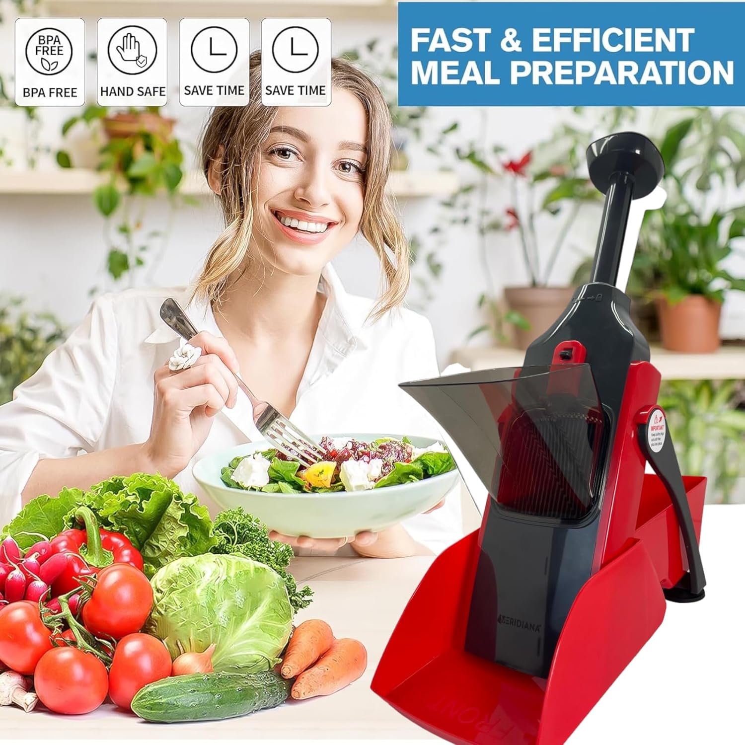 Fetta senza paura: questa mandolina professionale per verdure è stata progettata pensando alla tua sicurezza. Le lame della nostra tagliaverdure sono nascoste in modo sicuro per evitare incidenti.