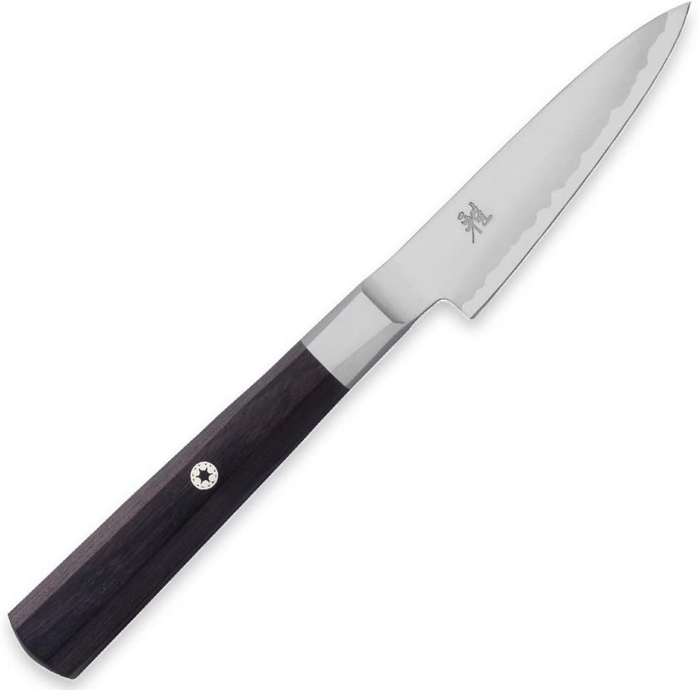 Coltello Miyabi Kudamono Lama Cm.9. La Serie Di Coltelli Miyabi 4000Fc È La Vera Tradizione Giapponese, Lo Fare Risaltare Una Lama In Acciaio Fc 61 Con Una Durezza Di 61 Rockwell, Quindi Una Elevata Durezza Che Permette Di Resistere Anche Ad Usi Pesanti. Il Disegno Che Si Può Notare Vicino Al Taglio Della Lama Riporta La Tradizione Della Forgiatura Delle Katane Giapponesi. L’Impugnatura Con Forma Ottagonale È Costruita In Legno Di Pakka Con Il Classico Perno O Pin Mosaico. Lama Asimmetrica In Acciaio Inossidabile Fc61 Prodotto In Giappone