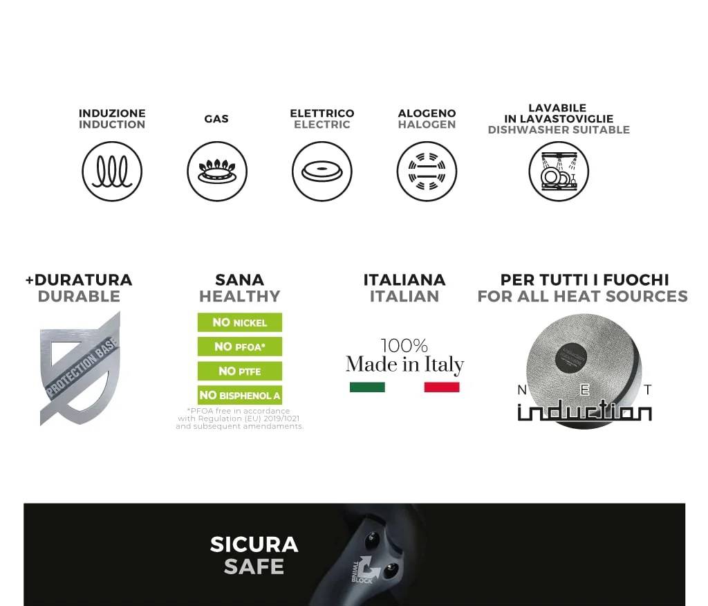 Corpo In Alluminio Forgiato Ad Alto Spessore Per Una Cottura Rapida E Uniforme. Per La Realizzazione Vengono Impiegate Solo Leghe Adatte Al Contatto Con Gli Alimenti. Le Leghe Autorizzate Non Contengono Arsenico, Piombo, Nichel O Cadmio. Protection Base: Uno Scudo Per La Tua Pentola È Il Sistema Di Applicazione Brevettato Moneta Che Garantisce Doppia Durata E Resistenza Dell’Antiaderenza. Durante La Verniciatura Viene Aggiunta Una Tecno-Superficie Intermedia Sulla Base Antiaderente E Un Ulteriore Strato Protettivo Con Micro-Cristalli In Grado Di Rinforzare E Sigillare L’Intera Superficie. No Pfoa, No Nichel, No Bisfenolo A. Manici E Maniglie Con Doppio Fissaggio Twin Block: Il Fissaggio A Doppia Vite Garantisce Massima Sicurezza E Stabilità Nel Tempo. I Manici Sono Realizzati In Bakelite. La Bakelite È Un Materiale Termoindurente Perciò Rimane Fredda Anche In Fase Di Utilizzo, Così Da Garantire Una Cucina Sicura, Senza Scottarsi. Fondo Net Induction Sfrutta Al Massimo I Campi Magnetici Induttivi Del Piano Ad Induzione, Trasferendoli In Termini Di Calore Generato Sul Fondo Del Pezzo. Adatto A Tutti I Piani Di Cottura E Idoneo Alla Lavastoviglie. Packaging Sostenibile In Carta Riciclata Proveniente Da Filiera Certificata Fsc. Imballi Secondari Plastic Free.