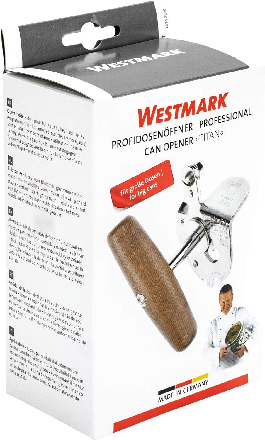 Apriscatole professionale per aprire lattine di grandi dimensioni per la gastronomia, Per usi commerciali Facile apertura di grandi lattine grazie alla lama tagliente e alla rotella in speciale acciaio indurito Dettagli speciali: Dimensioni compatte da tenere in un cassetto, Facile da maneggiare grazie al grande pomello in legno facile da afferrare Made in Germany: Lunga durata, Salva-spazio, Facile da pulire a mano, Non lavabile in lavastoviglie Contiene: 1x Westmark Apriscatole professionale, Con confezione, Titan, Dimensioni: 9,1 x 6 x 9,1 cm, Peso: 188 g, Materiale: Acciaio/Legno