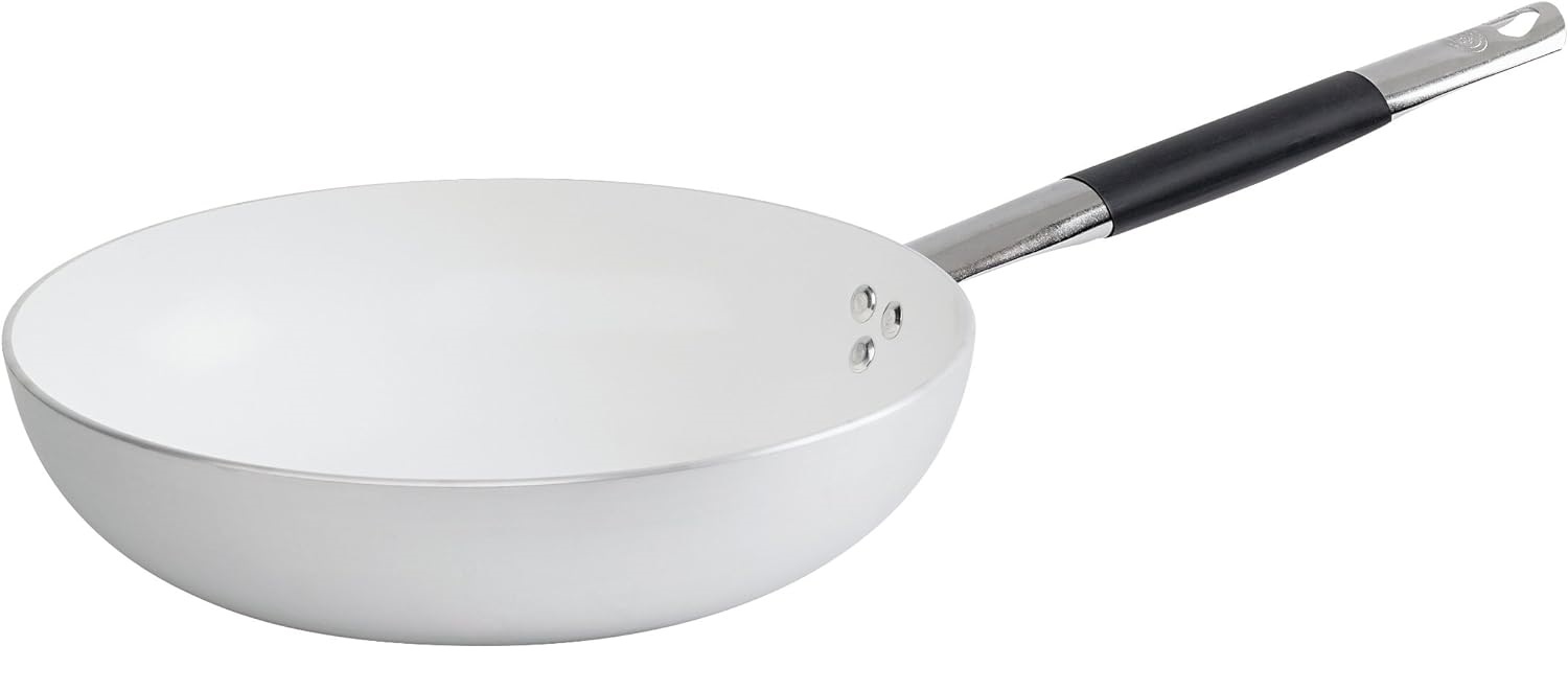 Padella svasata alta a saltare in alluminio, con rivestimento in ceramica bianca.