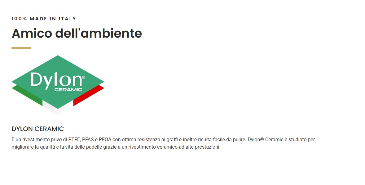 SALUTELLA GIGLIO È una linea di padelle e casseruole cilindriche. Rivestimento interno CERAMICO PFAS FREE salutare e resistente all’abrasione. Nel rispetto dell’ambiente Manici effetto soft-touch Fondo a induzione DYLON CERAMIC È un rivestimento privo di PTFE, PFAS e PFOA con ottima resistenza ai graffi e inoltre risulta facile da pulire. Dylon® Ceramic è studiato per migliorare la qualità e la vita delle padelle grazie a un rivestimento ceramico ad alte prestazioni. 100% MADE IN ITALY L’antiaderente certificato