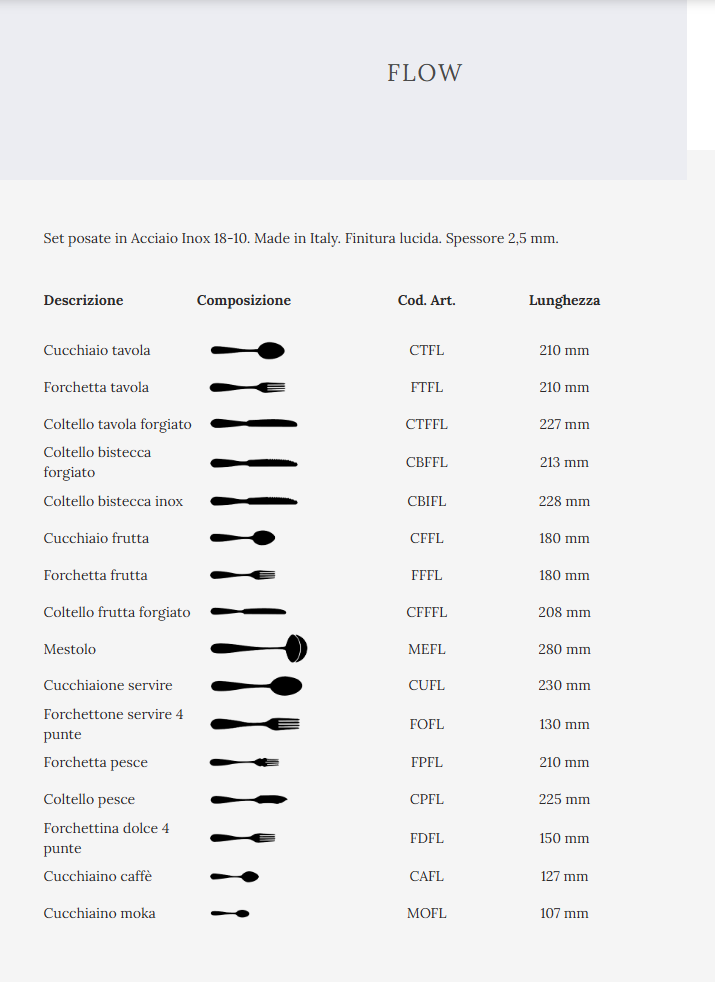 Scoprite l’eleganza senza tempo del modello Flow di Salvinelli. Caratterizzate da una finitura lucida cromata, queste posate sono l’aggiunta perfetta per il vostro servizio da tavola. Orgogliosamente prodotte in Italia, uniscono design raffinato e funzionalità per elevare ogni vostra esperienza culinaria. Spessore: 2,5 mm Misura: 227 mm Materiale: Acciaio forgiato
