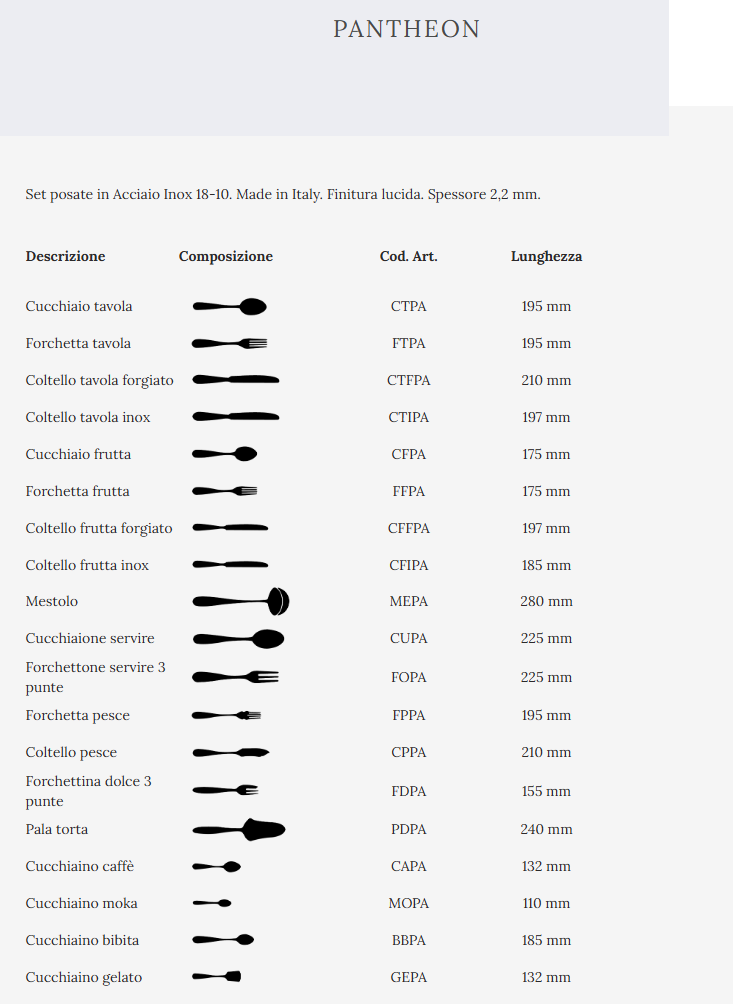Le posate della linea Pantheon di Salvinelli sono posate in acciaio inox 18/10 con finitura lucida a specchio e spessore di 2,2 mm, progettate per offrire ottima resistenza, robustezza e comfort nell’uso quotidiano o professionale. Spessore: 2,2 mm Misura: 195 mm Lavabili in lavastoviglie
