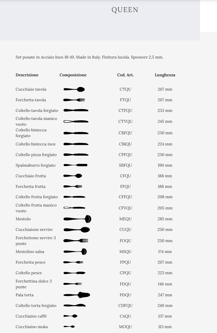 Set di posate in acciaio inox 18/10 di alta qualità, resistente alla corrosione e pensato per durare nel tempo. La finitura lucida valorizza ogni mise en place con un tocco di eleganza, mentre lo spessore di 2,5 mm assicura leggerezza e praticità d’uso. Prodotto in Italia, ideale per la tavola di tutti i giorni. Spessore: 2,5 mm Misura: 285 mm Lavabili in lavastoviglie
