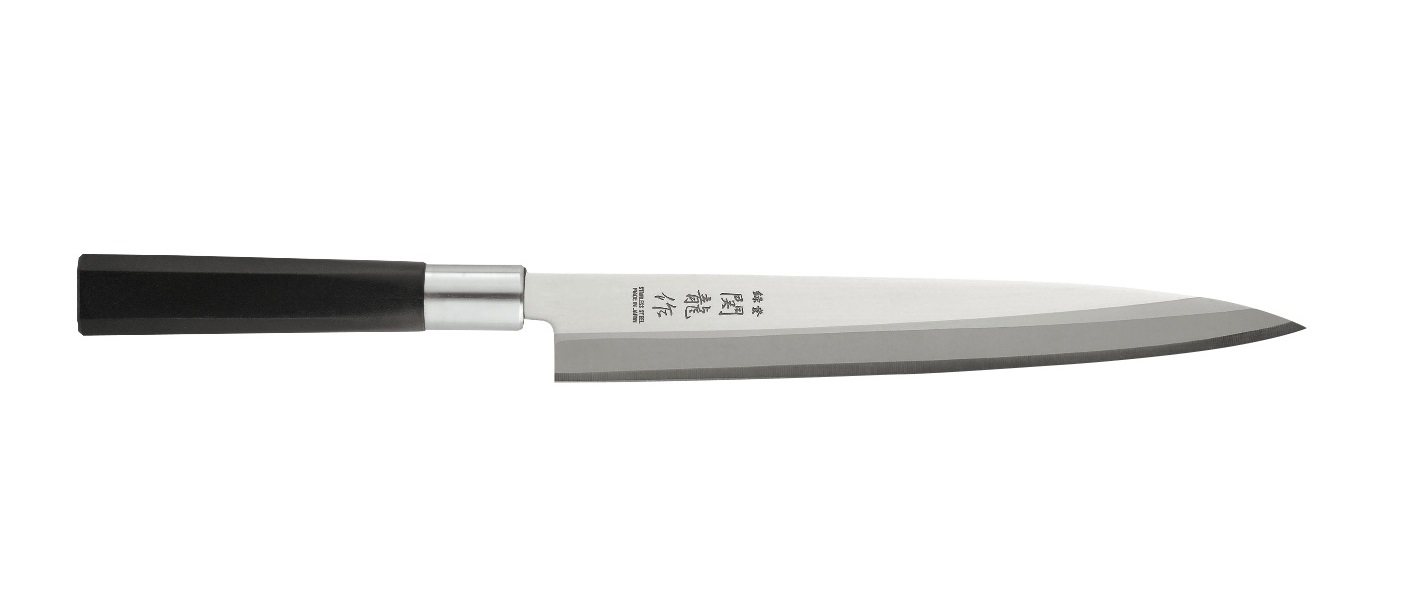 Il coltello giapponese Seki Ryu Yanagiba SRP240S è uno strumento tradizionale con lama da 24 cm, specificamente progettato per affettare pesce crudo per sashimi e sushi con precisione grazie alla sua affilatura asimmetrica su un solo lato. Specifiche e Materiali Il modello SRP240S è un coltello Yanagiba, noto anche come coltello da sashimi, caratterizzato da una lama lunga e sottile che permette un taglio netto e continuo. Lama: La lama è in acciaio inossidabile 420J2, un materiale che offre una buona resistenza alla corrosione. La sua lunghezza è di 24 cm (240 mm). Affilatura: È dotato di un’affilatura asimmetrica su un solo lato (smusso singolo orientale), una caratteristica chiave dei coltelli tradizionali giapponesi che ne esalta la precisione di taglio. Questa affilatura è ideale per destrimani. Durezza: La durezza Rockwell (HRC) è generalmente intorno a 51-53. Manico: Il manico è in propilene (plastica resistente), con una forma ottagonale che ne facilita l’impugnatura e garantisce igiene. È fissato saldamente con un condilo in acciaio inox per evitare oscillazioni. Utilizzo e Vantaggi Questo coltello è l’ideale per gli appassionati di cucina giapponese che desiderano preparare sushi e sashimi in casa. Precisione di Taglio: La lama lunga e l’affilatura asimmetrica consentono di ottenere fette di pesce sottili e uniformi in un unico movimento fluido, preservando la consistenza e l’aspetto del pesce. Facilità di Manutenzione: L’acciaio inossidabile e la durezza moderata rendono la lama facile da affilare con le pietre per affilatura appropriate. Rapporto Qualità/Prezzo: Come altri coltelli Seki Ryu, è considerato un’ottima opzione entry-level, offrendo un coltello specializzato a un prezzo accessibile