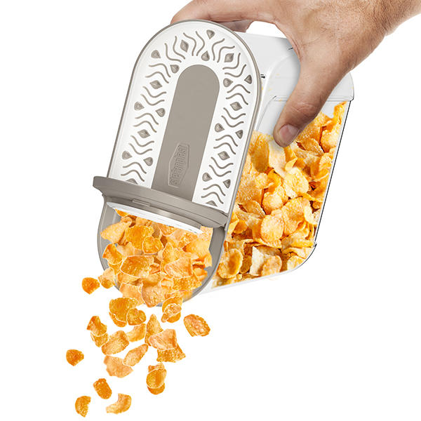 Barattolo portacereali in plastica trasparente, capacità 2lt, dotato di tappo a chiusura ermetica con dosatore e presa ergonomica.