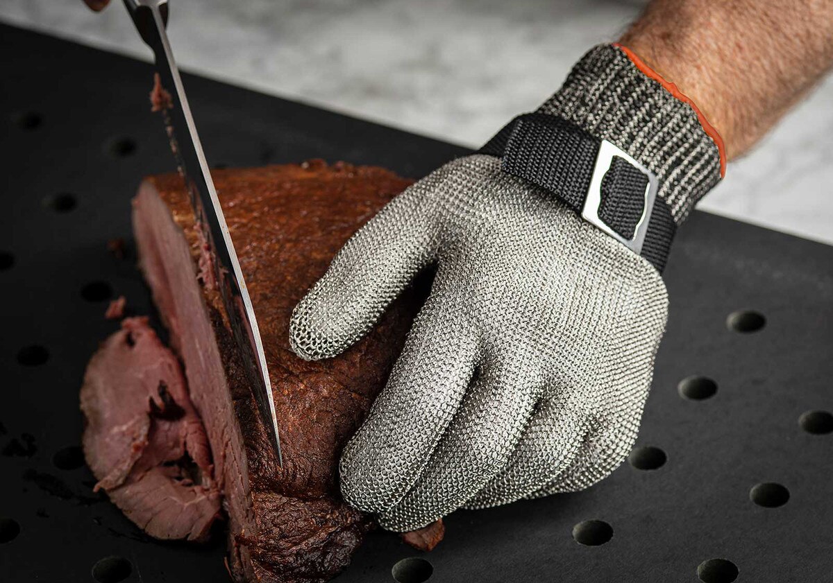 Questo guanto antitaglio extra-small di TableCraft è progettato per proteggere le mani durante la preparazione dei cibi. Realizzato in acciaio inossidabile intrecciato, questo guanto misura misura 23,5 x18,5 cm ed è dotato di un cinturino rosso per una facile identificazione. La sua struttura resistente garantisce un utilizzo prolungato, mentre il guanto protettivo bianco incluso aggiunge un ulteriore livello di sicurezza. Ideale sia per le cucine professionali che per i cuochi casalinghi, questo guanto offre una protezione affidabile contro tagli e abrasioni. • Modello n.: 11740 • Livello di taglio ANSI 9 • Realizzato in acciaio inossidabile con guanto in poliestere rimovibile (guanto singolo, guanto interno singolo) • Design ambidestro