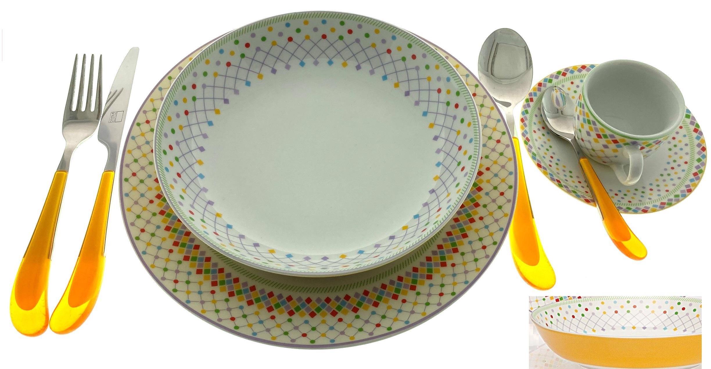 Servizio Porcellana 6 Piatti Piani 6 Piatti Fondi 6 Piatti Frutta 6 Forchette Tavola 6 Cucchiai Tavola 6 Coltelli Tavola 6 Cucchiaini Caffè 6 Tazza Da Caffè + 6 Piattini 6 Bicchieri Da Acqua