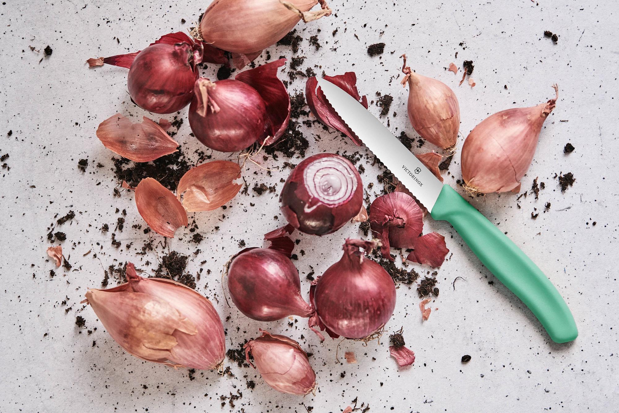 Affetta i frutti morbidi con facilità Sbuccia e taglia a dadini senza problemi Taglia velocemente le bucce più dure Prepara piatti complessi Prepara qualsiasi piatto come un professionista con questo coltello per verdure. Questo coltello versatile eccelle nell’affettare pomodori, avocado e fichi, e taglia senza sforzo anche melograni, litchi e frutti della passione. Per affettare, tagliare a dadini, sbucciare o affrontare lavorazioni più complesse, questo coltello è pronto per qualsiasi sfida. Coltello per verdure a filo ondulato con punta appuntita Questo coltello per verdure è dotato di un’affilata lama professionale in acciaio inossidabile a filo ondulato con punta appuntita, ideale per un’ampia gamma di attività di preparazione da svolgere con precisione. Il suo leggero manico ergonomico è progettato per offrire comfort e controllo ottimali. Realizzato in Svizzera e adatto alla lavastoviglie, garantisce affidabilità ed efficienza per l’uso quotidiano in cucina. Altezza: 11 mm Lunghezza: 189 mm Ampiezza: 20 mm Peso: 20 g Lunghezza della lama: 8 cm Materiale: Polipropilene (PP) Lavabile in lavastoviglie