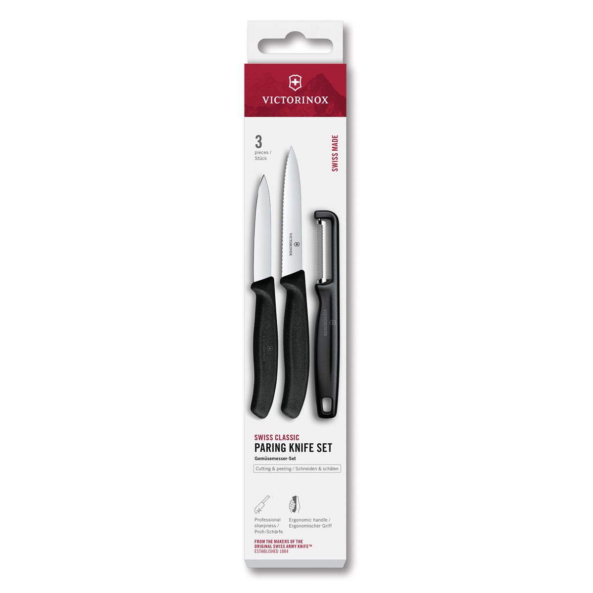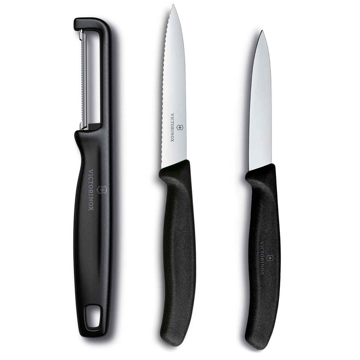 Il set Victorinox Swiss Classic è un set compatto e pratico per la preparazione di frutta e verdura. Gli strumenti sono realizzati in Svizzera con acciaio inossidabile di alta qualità. Contenuto del set (3 pezzi): Un pelaverdure con lama a I (universale). Un coltello da pomodori con lama seghettata (lunghezza lama 10 cm). Uno spelucchino con lama liscia e punta centrata. Caratteristiche Principali: Materiale: Lame in acciaio inossidabile e manici in polipropilene (PP). Versatilità: Ideale per sbucciare, affettare e tagliare a cubetti frutta e verdura. Praticità: Gli articoli sono adatti alla lavastoviglie